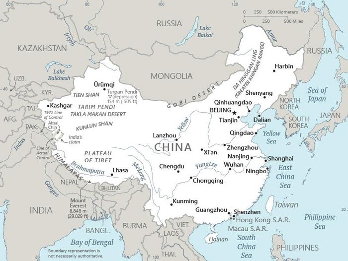 China: China map showing major cities as well as the many bordering East Asian countries and neighboring seas.