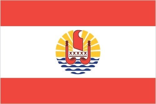 French Polynesia: two red horizontal bands encase a wide white band in a 1:2:1 ratio; centered on the white band is a disk with a blue and white wave pattern depicting the sea on the lower half and a gold and white ray pattern depicting the sun on the upper half; a Polynesian canoe rides on the wave pattern; the canoe has a crew of five represented by five stars that symbolize the five island groups; red and white are traditional Polynesian colors, note: identical to the red-white-red flag of Tahiti, the largest and most populous of the islands in French Polynesia, but which has no emblem in the white band; the flag of France is used for official occasions