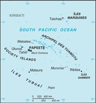 French Polynesia: Oceania, five archipelagoes (Archipel des Tuamotu, Iles Gambier, Iles Marquises, Iles Tubuai, Society Islands) in the South Pacific Ocean about halfway between South America and Australia