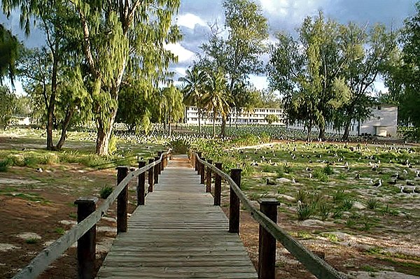 Albatross and bonin petrel nests may be seen on both sides of a walkway on Sand Island, Midway Atoll National Wildlife Refuge