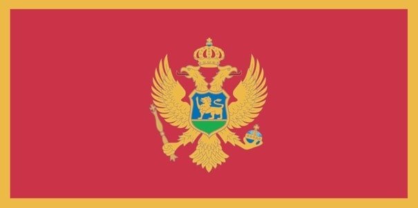 Montenegro: a red field bordered by a narrow golden-yellow stripe with the Montenegrin coat of arms centered; the arms consist of a double-headed golden eagle - symbolizing the unity of church and state - surmounted by a crown; the eagle holds a golden scepter in its right claw and a blue orb in its left; the breast shield over the eagle shows a golden lion passant on a green field in front of a blue sky; the lion is a symbol of episcopal authority and harkens back to the three and a half centuries when Montenegro was ruled as a theocracy<br />