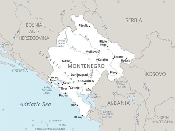Montenegro: Montenegro map showing major population centers as well as parts of surrounding countries and the Adriatic Sea.