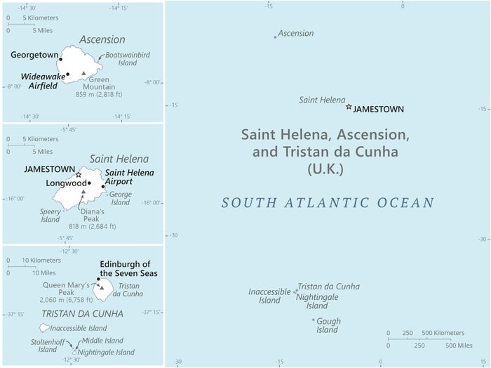 Saint Helena, Ascension, and Tristan da Cunha: islands in the South Atlantic Ocean, about midway between South America and Africa; Ascension Island lies 1,300 km (800 mi) northwest of Saint Helena; Tristan da Cunha lies 4,300 km (2,700 mi) southwest of Saint Helena