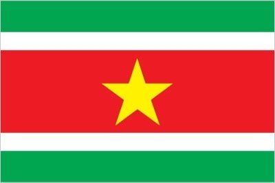 Suriname: five horizontal bands of green (top, double width), white, red (quadruple width), white, and green (double width); a large, yellow, five-pointed star is centered in the red band; red stands for progress and love, green symbolizes hope and fertility, white signifies peace, justice, and freedom; the star represents the unity of all ethnic groups; from its yellow light the nation draws strength to bear sacrifices patiently while working toward a golden future<br />