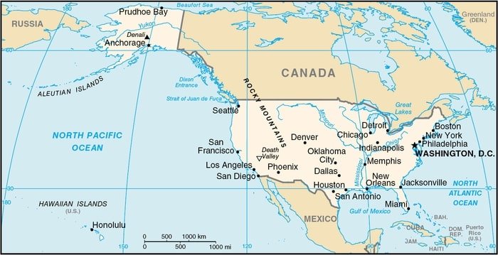United States: United States map showing the United States – including Alaska and Hawaii – within northern North America. Most major US cities are indicated.